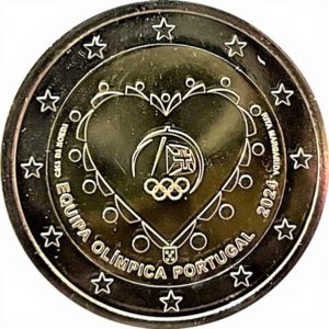 Das Thema der zweiten Münze lautet „Portugals Teilnahme an den 33. Olympischen Spielen 2024“. Auf der Bildseite ist eine Reihe von Personen dargestellt, die ein großes Herz und eine kollektive Umarmung darstellen. Die 15 Kreise symbolisieren die Olympischen Ringe und die Kontinente, die repräsentiert werden. Die untere Spitze der Herzform wird vom Wappen Portugals gekrönt. In der Mitte befindet sich das Logo des portugiesischen Olympischen Komitees. Am unteren Bildrand ist der Ausgabeanlass und -staat „EQUIPA OLÍMPICA PORTUGAL“ sowie die Jahreszahl „2024“ zu erkennen. Am linken Bildrand der Schriftzug der Prägestätte „CASA DA MOEDA“, am rechten Bildrand der Name der Münzgestalterin „RITA MARGARDIDA“. Auf dem äußeren Münzring sind die zwölf Sterne der Europaflagge dargestellt. Die von Rita Margardia gestaltete Münze erscheint in einer Gesamtauflage von 520.000 Ex., davon jeweils 10.000 Ex. in BU-Coincard sowie im Spiegelglanz-Folder.